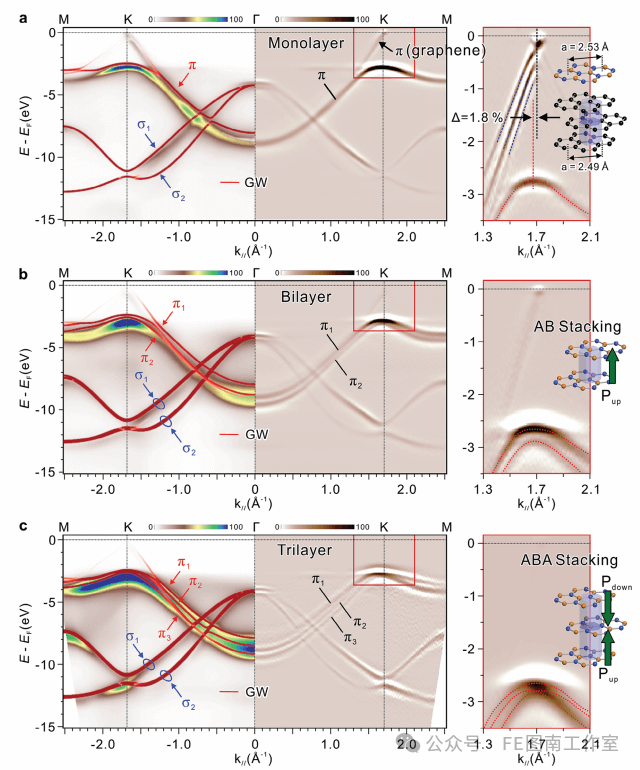 图2:a-c) 单层、双层、三层h-BN/石墨烯的角分辨光电子能谱(ARPES)及GW理论计算的能带结构,显示π带分裂特征。