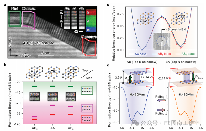 图3:a) h-BN/石墨烯/SiC基底的STEM-ADF截面图及元素分布;b) h-BN/石墨烯异质结构形成能计算;c) 不同堆叠构型的相对形成能;d) 外电场调控双层h-BN极化方向的示意图。