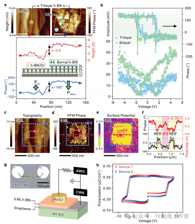 图4:a) 双层与三层h-BN的PFM相位图及高度剖面;b) 铁电回线与蝴蝶曲线;c-f) 三层h-BN的“盒中盒”畴工程(形貌、相位、表面电势);g) 5层h-BN铁电器件结构;h) P-E回线测量结果。
