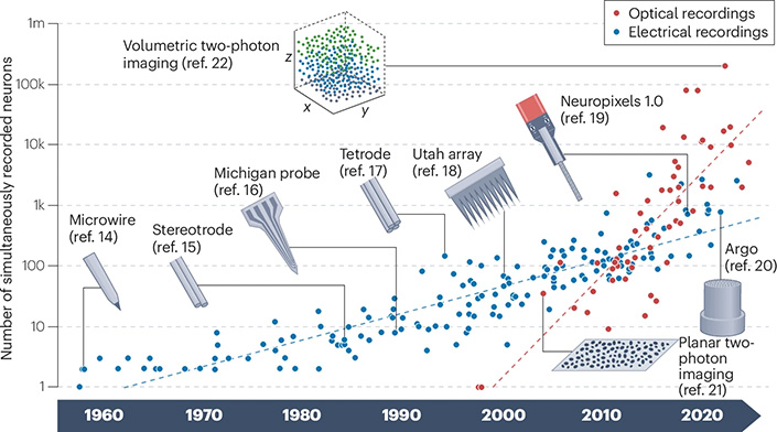 这条时间轴追溯了神经记录技术从 20 世纪 50 年代开始的发展历程。这一演变证明了神经生理学领域对摩尔定律的遵循。资料来源:库兹姆实验室