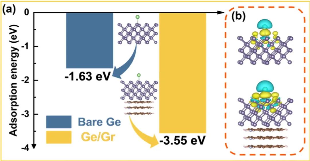 图1:(a) 裸Ge和Ge/Gr表面的锂离子吸附能;(b) 裸Ge和Ge/Gr结构表面锂离子的差分电荷密度。