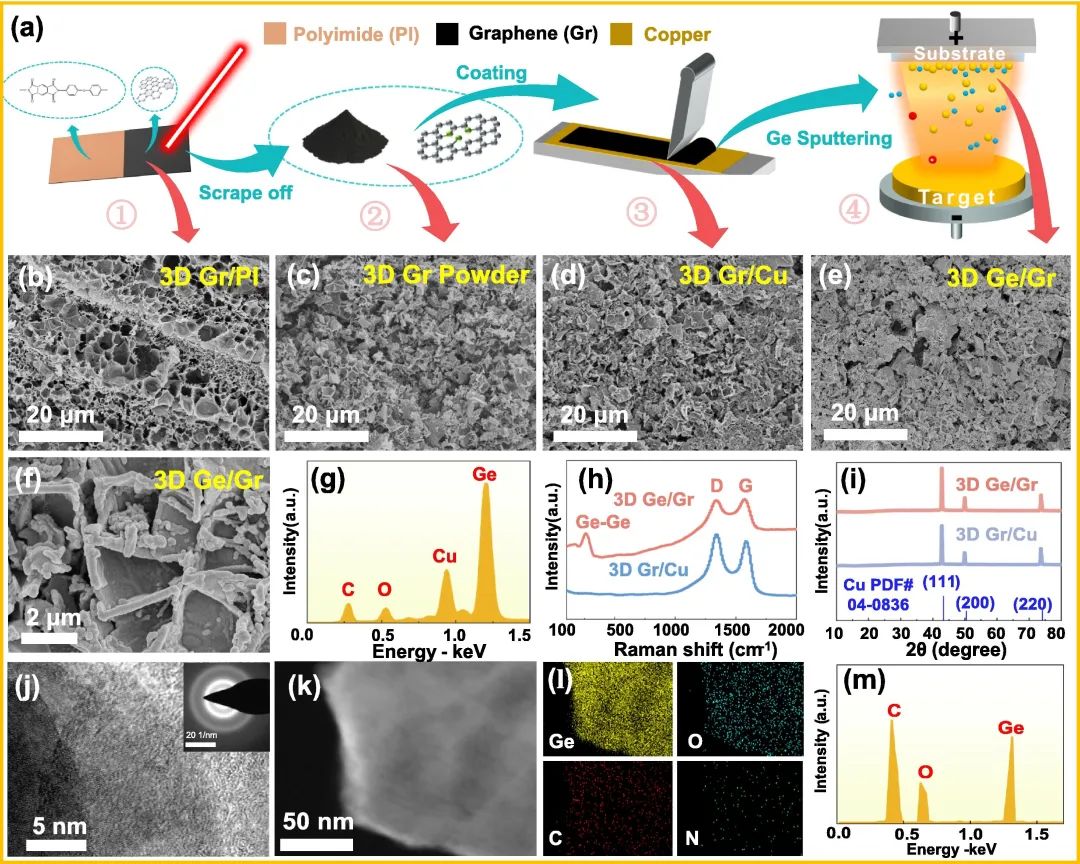 图2:(a) 3D Ge/Gr电极制备过程示意图;(b) 3D Gr/PI;(c) 3D Gr粉末;(d) 3D Gr/Cu集流体;(e-f) 3D Ge/Gr阳极;(g) EDS图案;(h) 3D Ge/Gr阳极和3D Gr/Cu集流体的拉曼光谱;(i) 3D Ge/Gr阳极和3D Gr/Cu集流体的XRD结果;(j) 3D Ge/Gr阳极的HRTEM图像,插图对应SAED图案;(k) 暗场TEM图像;(l) 元素分布图;(m) 3D Ge/Gr阳极的EDS光谱。