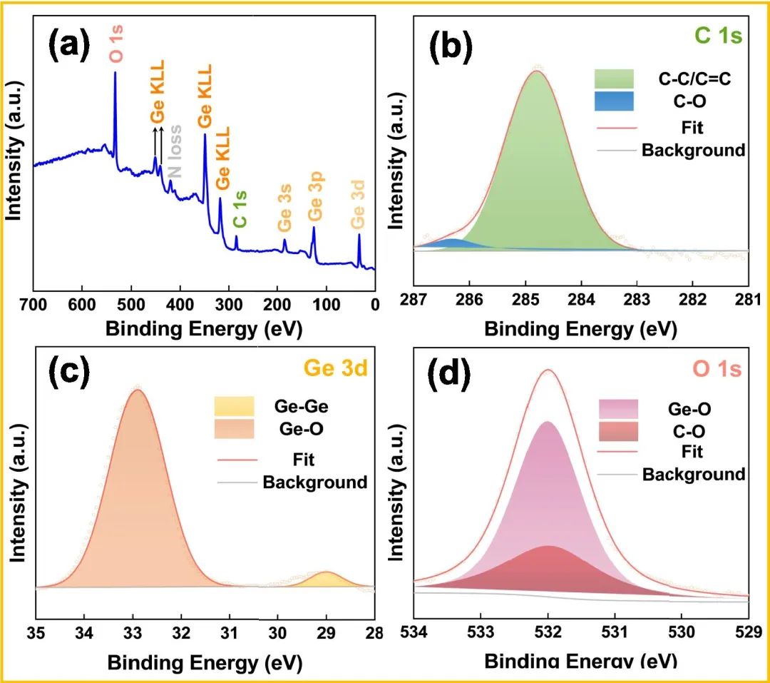 图3:3D Ge/Gr阳极的XPS光谱。(a) 全谱;(b) C 1s;(c) Ge 3d;(d) O 1s。