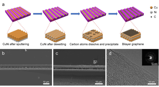 图3. 铜镍合金作为生长基底的双层石墨烯条带的成核及生长机理。