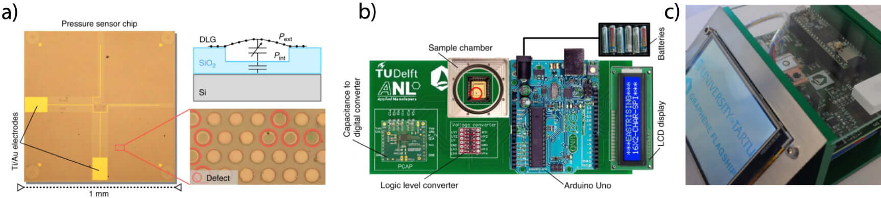 使用高端设备进行二维材料传感器的实验室演示可以达到技术就绪水平(TRL)3-4 级,而要达到 TRL 5-6 级或更高,则需要在真实环境中进行验证。这就需要将传感器、读出电子装置和数据处理集成到便携式原型中。带电子读出功能的晶圆级传感器芯片具有成本低、功耗低和体积小的优势。这些芯片可在印刷电路板上制成小巧的传感器模块,由电池供电,并可通过无线接口和显示器进行增强。下图是这种原型的一个示例,显示了带有电容读出电子元件、Arduino 处理器、显示器和电池的石墨烯压力传感器原型。