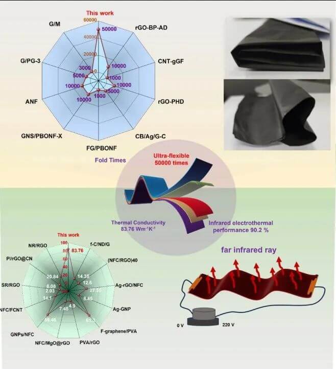 CU含有羟基,分子间具有很强的氢键相互作用,可增强石墨烯浆料的界面相容性,减少石墨烯团聚。SiO2纳米粒子可通过氢键相互作用牢固地固定在石墨烯薄片表面,有效防止石墨烯聚集。CMC与Gr具有多种键合模式,可促进薄膜扩散并显著提高柔韧性。在水解过程中,CMC 会释放出 Na,进一步稳定石墨烯的分散。同时,还采用了一种创新的铺膜工艺–悬浮涂布和浇铸法制备了大面积超柔性石墨烯电热膜(HF-Gr/CMC)。这种工艺简单易行,无需热处理,因此大大降低了生产成本,同时具有大规模生产的潜力。所获得的薄膜具有出色的耐久性,可在保持稳定性能的情况下进行180度折叠50,000次,大大超过了所报道的石墨烯基复合电热膜的耐折值。此外,薄膜的加热温度分布均匀,热辐射效率高达90.2%,热导率高达83.76Wm+-1 K-1。这些特性为石墨烯电热膜领域的持续改进和发展提供了可行的解决方案。