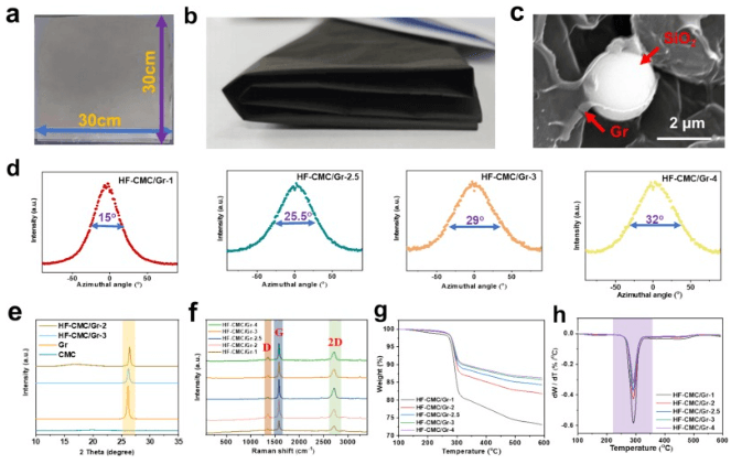 图2、(a, b) HF-CMC/Gr films before and after folding. (c) SEM images of HF-CMC/Gr films surface. (d) WAXS spectra of HF-CMC/Gr films. (e) XRD patterns and (f) Raman spectra and (g, h) TGA tests.