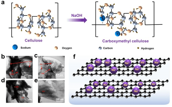 图3. (a) Schematic diagram of the production of carboxymethyl cellulose from cellulose through alkali treatment. (b-e) TEM images of the HF-CMC/Gr films. (f) Modification of graphene by Na.+