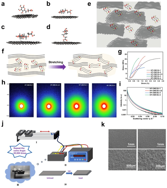 图5. (a-d) Interactions of corresponding structural configurations in the Gr-CMC system. (e) A cartoon representation of the CMC-bridged HF-CMC/Gr films. (f) After the application of force, the interlayer slip distance increases due to the opening of CMC bond angles. (g) Tensile performance. (h) SAXS pictures of HF-CMC/Gr films. (i) The corresponding scattering intensity curves of HF-CMC/Gr films. (j) Folding endurance test of the HF-CMC/Gr-3 films. (k) SEM images of the HF-CMC/Gr-3 films before and after folding tests.