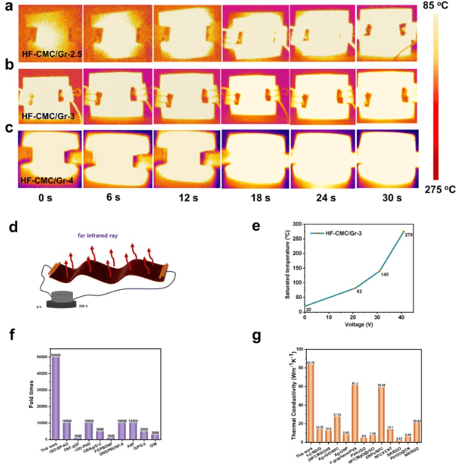 图6. (a-c) Schematic infrared image of the HF-CMC/Gr films after being heated by infrared radiation for a period of time. (d) Schematic diagram of the heating principle of the HF-CMC/Gr films. (e) Variation of heating temperature with voltage. (f) The comparison of the flexibility of HF-CMC/Gr-3 films with other recently reported carbon film materials (For details refer to Table S3). (g) The thermal conductivity of HF-CMC/Gr-3 films compared to other recently reported thin film materials. (For details refer to Table S4).