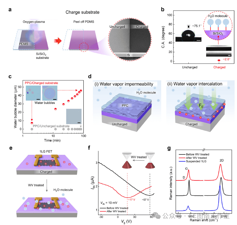 图2. 等离子体对基底表面的改性及其对润湿性的影响。a,b) 经氧等离子体处理和未经处理的SiO2/Si晶片表面的扫描电子显微镜(SEM)图像和接触角(C.A.)比较。c) 带电(红色圆圈)和不带电(灰色圆圈)基底界面处水分积聚的比较。插图显示了水滴的光学图像。比例尺:10微米。d) 比较不同极性界面上水分子插层能力的示意图。e) 带电基底上石墨烯场效应晶体管(FET)在WV处理前后的示意图。f) 在带电SiO2表面上制备的石墨烯FET器件在WV处理前(黑线)和后(红线)的转移曲线。源漏电压为Vds = 10 mV。g) 石墨烯在基底上WV处理前(黑线)和后(红线)的拉曼光谱。此处,悬浮石墨烯的拉曼光谱(蓝线)作为参考。