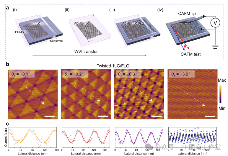 图3. 扭转单层石墨烯(1LG)/褶皱层石墨烯(FLG)的制备与表征。a) 1LG/FLG扭转结构的制备步骤和导电原子力显微镜(CAFM)测量的示意图。b) 不同扭转角度下1LG/FLG莫尔结构的CAFM图像。c) 不同扭转角度下1LG/FLG莫尔结构的表面电流曲线。比例尺为50纳米。