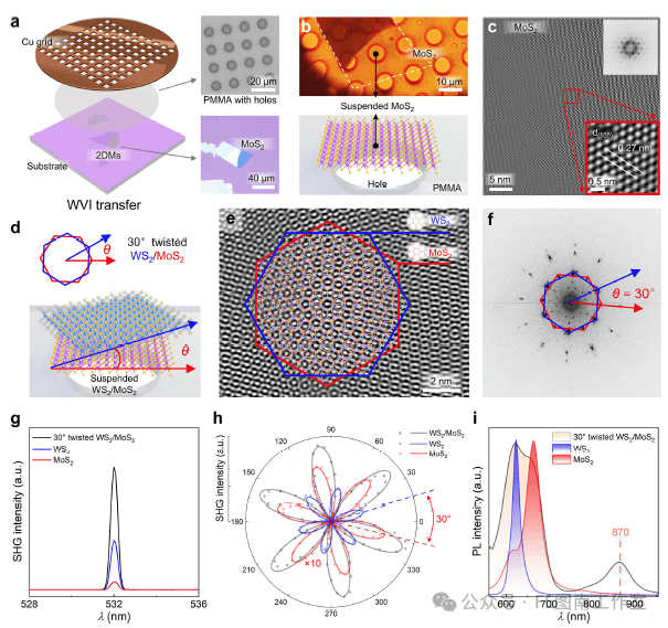 图4. 悬浮二维材料(2DM)和异质结构的制备与表征。a) 悬浮于聚甲基丙烯酸甲酯(PMMA)孔阵列上的二维材料的制备过程。b) 悬浮于铜网上的MoS2/PMMA的光学图像和示意图。c) 悬浮MoS2的原子分辨率透射电子显微镜(TEM)图像,插图为快速傅里叶变换(FFT)衍射图样。d) 悬浮WS2/MoS2的结构模型。e) WS2/MoS2异质结构的TEM图像,呈现出12重Stampfli膨胀准晶特征。f) 傅里叶变换图样表明扭转角为30°。g) WS2/MoS2异质结构、WS2层(蓝色曲线)和MoS2层(红色曲线)的二次谐波产生(SHG)光谱。h) 极化分辨的平行SHG强度极图。i) 30°扭转WS2/MoS2异质结构(黑色)的归一化光致发光(PL)光谱,以及单独的WS2层(蓝色)和MoS2层(红色)的光谱。