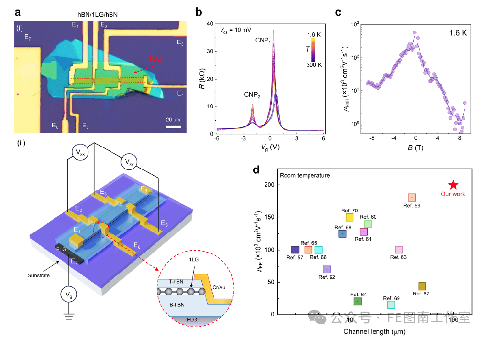 图5. 高性能hBN/1LG/hBN超晶格器件。a) 采用扭转角可控的WVI转移技术制备的hBN/1LG/hBN异质结构器件的光学图像(i)和示意图(ii)。b) hBN封装的1LG器件的电阻随温度变化的关系图,测量温度范围为1.6 K至300 K。c) 在1.6 K下测量的器件霍尔迁移率𝜇与磁场之间关系的曲线。d) 本研究中石墨烯在室温下的迁移率与之前报道的比较。