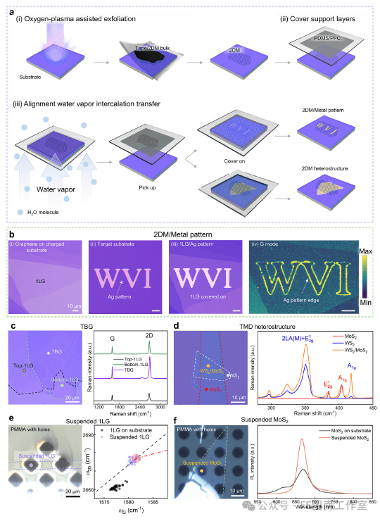图1. 二维材料(2DMs)的水汽界面(WVI)转移方法。a) 对准WVI转移方法的示意图。b) 使用WVI方法制备的石墨烯/银(Ag)结构。首先,(i)在带电的SiO2/Si基底上剥离出单层石墨烯(1LG)。然后,(ii)和(iii)将1LG转移到Ag图案上。通过这种方式,(iv)实现了1LG/Ag图案的拉曼增强。比例尺:10微米。c,d) 该方法能够制备各种异质结构,如扭转双层石墨烯(TBG,由顶部(T)-1LG和底部(B)-1LG组成)(c)和WS2/MoS2异质结构(d)。e) 左图:通过WVI转移方法制备的悬浮1LG的光学图像,其中1LG由紫色虚线勾勒。右图:支撑和悬浮1LG中40个不同位置的G峰(𝜔G)和2D峰(𝜔2D)拉曼频率的比较分析。红色标记点及其周围区域表示本征1LG性质的拉曼表征。f) 左图:通过WVI转移方法制备的悬浮MoS2的光学图像。右图:通过WVI转移方法制备的悬浮MoS2与支撑MoS2的光致发光(PL)强度比较。