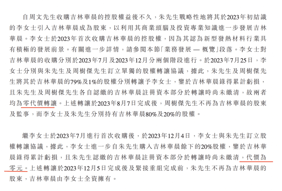 2023年6月1日,周文将其于吉林华晨的99%及1%的股权分别转让予朱有新及周树杰,从而撤出于吉林华晨的投资,鉴于吉林华晨录得累计亏损,且其认缴的吉林华晨注册资本部分于转让时尚未缴清,故两者均为零代价转让。上述转让完成后,周文不再为吉林华晨的股东,而朱有新及周树杰分别持有吉林华晨99%及1%的股权。