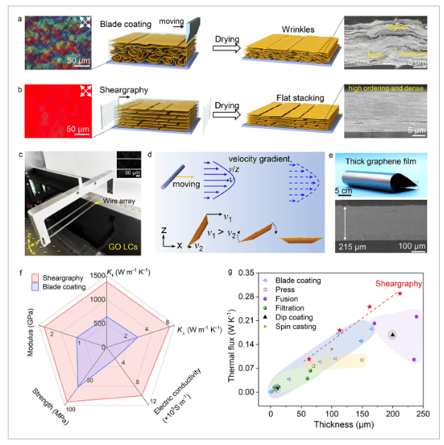 厚度达数百微米的高性能石墨烯薄膜具有更高的热传导能力,有望解决严峻的热管理需求。然而,厚石墨烯薄膜的导热系数有限,低于1000Wm-1K-1,这是由于薄膜内部的皱褶缺陷造成的。本文,浙江大学高超 教授、高微微 副教授、Peng Li、刘英军 教授等在《Small》期刊发表名为“Scalable High-Performance Graphene Films Over Hundreds Micrometer Thickness via Sheargraphy”的论文,研究提出了一种剪切方法,以精确调节液晶的薄片排列,从而获得厚度为215µm 的石墨烯薄膜,其平面内热导率达到创纪录的1380Wm-1K-1。水平移动的金属丝阵列产生的5µm 的微尺度剪切场可压平片状皱纹,并消除氧化石墨烯液晶的多晶性。