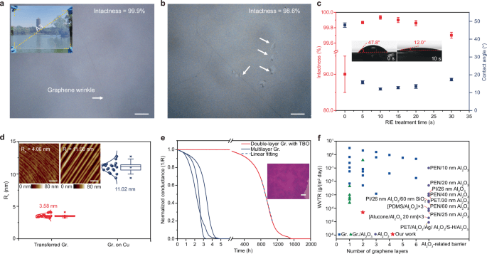 图2:双层石墨烯势垒膜的无裂纹转移和势垒性能。a, b经过(a)和未经过(b)基于rie的表面修饰的石墨烯转移到PEN/PVDF支撑膜上的典型OM图像。插图(a): a3尺寸的双层石墨烯阻隔膜照片,透过透明的石墨烯阻隔膜,可以看到北京大学未名湖和博雅塔。c转移到PVDF/PEN薄膜上的石墨烯的完整性(红色)和石墨烯表面PVDF溶液的测量接触角(蓝色)作为RIE处理时间的函数。插图:未经(左)和经过10 s RIE处理(右)的PVDF溶液在石墨烯表面的照片,分别显示接触角为47.80和12.00。d在Cu上生长的石墨烯(蓝色)和转移到PVDF/PEN支撑膜上的石墨烯(红色)的测量平均粗糙度(Ra)摘要。插图:石墨烯在Cu上生长(右)和石墨烯转移到PVDF/PEN支撑膜上(左)的典型AFM图像。e迁移多层石墨烯(蓝色)和制备双层石墨烯(红色)覆盖的Ca膜归一化电导率随测量时间的变化,在25℃和45% RH下,WVTR分别为2 × 10−2和5 × 10−5 g/(m2·天)。插图:转移到SiO2/Si衬底上的多层石墨烯的OM图像。f总结以往报道的石墨烯基势垒膜WVTR值与石墨烯层(蓝色),Al2O3/石墨烯复合势垒膜(绿色),纯Al2O3势垒膜(紫色)和工作中的WVTR值的函数关系。
