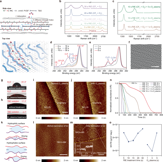 图3:表面修饰和嵌入TBO分子对改善势垒性能的贡献。侧视图(上)和顶视图(下)的双层石墨烯势垒膜结构示意图。TBO分子将被吸附在涂有羟基的石墨烯表面。b, c拉曼光谱的原始石墨烯,石墨烯处理5、10、15、20、30年代RIE (CF4和氧气)(b)和10 s RIE (CF4和氧气)和1、3、5 s氧等离子体(40 W功率)(c), d, e c1 XPS谱的原始石墨烯,石墨烯处理5、10、15、20、30年代RIE (CF4和氧气)治疗(d)和10 s RIE (CF4和氧气)和1、3、5 s氧等离子体(40 W功率)(e)。f典型ADF-STEM图像显示石墨烯晶格没有缺陷。g,h TBO溶液(g)和纯净水(h)在原始石墨烯(上)和经氧等离子体处理(40 W功率,处理时间3 s)的石墨烯(下)上的接触角照片。i, j TBO分子自旋涂覆后(40 W功率,3 s处理时间),未经(i)和经过(j)氧等离子体处理的SiO2/Si上单层石墨烯的AFM图像。k在干燥过程中,亲水(上)和疏水(下)石墨烯层之间的压力梯度驱动被困水层的运动示意图。l, m TBO包覆h-BN表面(l)和石墨烯/TBO/h-BN表面(m)的AFM图像。n, o采用5、10、15、20、30 s RIE (CF4和氧)、10 s RIE (CF4和氧)和1、3、5 s氧等离子体处理(n),测量了在25℃和45% RH条件下,被双层石墨烯覆盖(插有TBO分子)的Ca膜的归一化电导率,并总结了得到的WVTR值(o)。