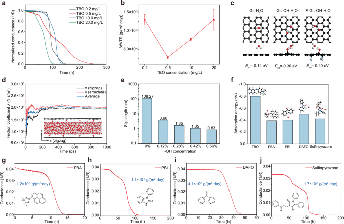 图4:TBO浓度和插层分子选择对制备膜势垒性能的影响。a, b在25°C和45% RH条件下,由不同浓度TBO嵌入的双层石墨烯覆盖的Ca膜的归一化电导率随测量时间的变化(a),以及所得WVTR值随TBO浓度变化的总结(b)。c计算了水分子在原始石墨烯、羟基修饰石墨烯(Gr.-OH)和背面氟化的羟基修饰石墨烯表面(F-Gr.-OH)上吸附的吸附能和结构。d计算了x(之字形)、y(扶手椅)方向的摩擦系数,以及采用Green-Kubo方程计算的0.12%羟基化石墨烯在1ns内的平均摩擦系数值。e在羟基化率为0%、0.12%、0.28%、0.42%和0.56%时,得到的水分子在石墨烯上的滑动长度。f TBO、1-苯基-1-硼酸蒎醇酯(PBA)、1-苯基- 1h -苯并[d]咪唑-2(3H)- 1 (PBI)、4,5-重氮芴-9- 1 (DAFO)和亚砜吡酮对H2O的吸附能。g-j Ca薄膜的电导率随测量时间的函数。