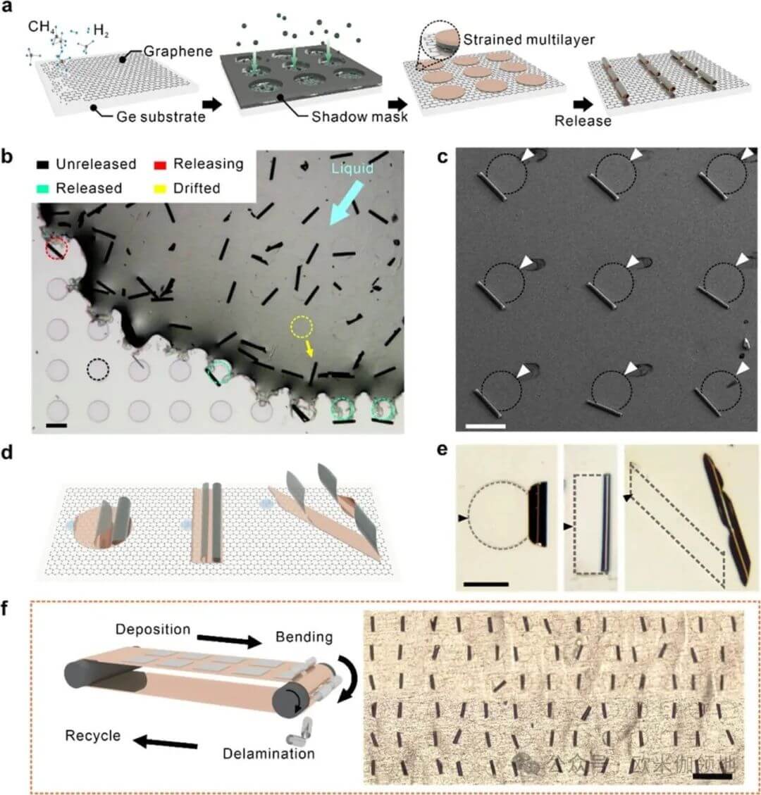 滚动折纸的形态可以通过应用不同形状的荫罩来调整。圆形纳米膜形成具有拱形边缘的微管,矩形纳米膜形成具有光滑边缘的微管,而具有螺旋形状的纳米膜形成螺旋结构。此外,释放的微结构可以很容易地转移到新的基板上。应变纳米膜在从石墨烯剥离后,首先转移到目标基底上,然后释放以构建微管。除了液体触发分层之外,还提出了一种卷对卷制造策略,铜箔上的石墨烯由于其柔性而被利用,并且多层纳米膜的阵列被沉积到基底上。当样品缠绕在辊上时,纳米膜自发地从基底上脱离并卷起成3D管状微结构,这种现象归因于由弯矩产生的额外的内部应变梯度。最终获得了Si/Ti/Ni纳米膜的6 × 13微管阵列,证明了该方法的可行性(图1f)。
