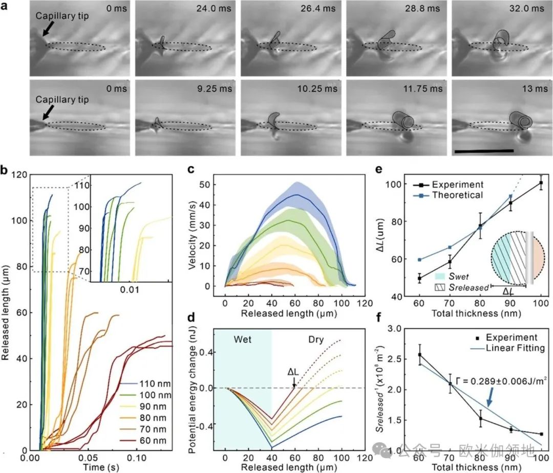 为了深入了解石墨烯上容易分层的机制,首先对石墨烯-纳米膜界面和纳米膜中内部应变梯度之间的相互作用进行了研究。高速相机从侧面记录动态分层过程,发现当微毛细管从左侧与纳米膜的边缘接触时,乙醇插入纳米膜-基底界面并将纳米膜的边缘从基底剥离,这是一个相对缓慢的过程(第二列)。随着微滴前进,释放区域扩大,独立部分弯曲成管状几何形状(第三列),其向前滚动。纳米膜的滚动反过来又引起进一步的分层,并且纳米膜从微毛细管附近的区域分离,该区域被乙醇微滴润湿(第三至第四列)。分层持续了几微秒,直到它最终在纳米膜的右侧终止(第五列)。分层过程能量计算揭示了其分层的本质原因,此外热触发释放也被成功地充分验证,归因于由热膨胀系数失配产生的附加内部应变梯度,这也预示了其他无蚀刻释放方法的潜力。
