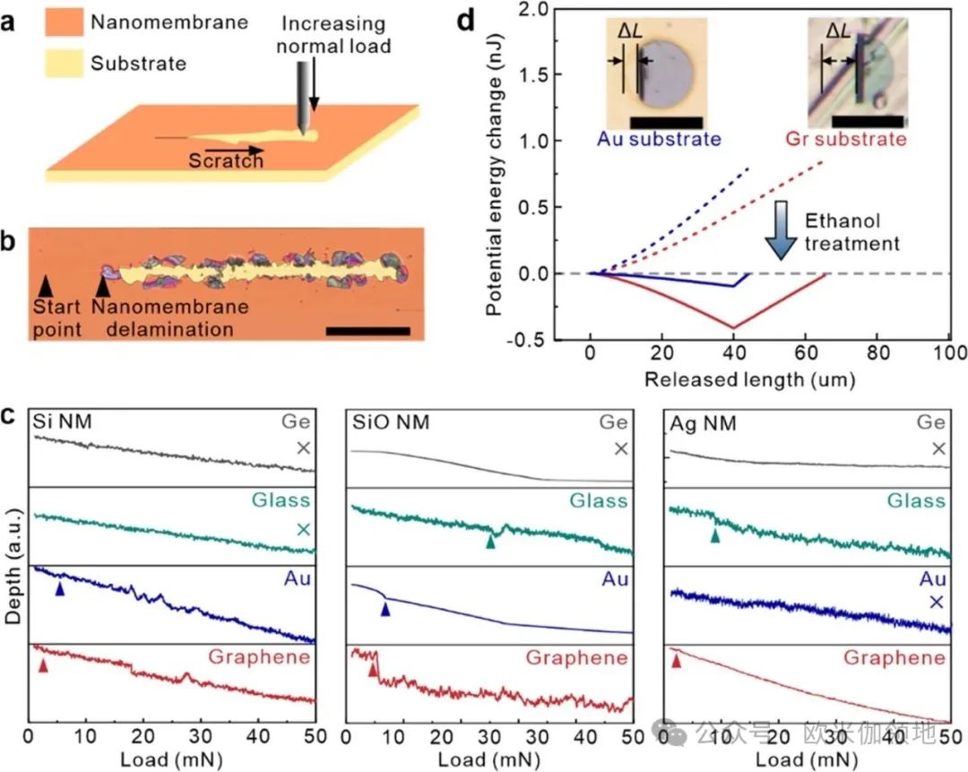 能量分析突出了纳米膜和其底层基底之间的粘合剂相互作用对成功分层的影响。因此,石墨烯的弱粘附作用导致纳米膜易分层和多用途材料的微结构制造。进行纳米压痕测试以比较石墨烯与Au、玻璃和裸锗衬底的粘附,测试的结果表明,随着负载的增加,划痕深度成比例地增加,直到负载力达到临界点,在该临界点处深度经历突然变化,表明纳米膜从基底分层。半导体、氧化物和金属材料的Si、SiO和Ag纳米膜在四个基底上进行测试,所有三种材料从石墨烯剥离所需的临界载荷非常低,而SiO纳米膜未能从玻璃基板上分层,Ag也未能从Au基板上分层,并且对于Ge基板上的任何材料都没有观察到分层,突出了石墨烯的特定作用。