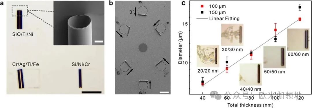 接着研究人员对石墨烯上管状微结构的精确控制进行了系列研究。通过使用硬掩膜明确沉积区域,成功制备多个微管,包括纯金属微管和混合微管。控制滚动方向对折纸的最终结构至关重要,实验中发现圆形纳米薄膜的滚动方向不同会形成不同微管结构以及纳米膜的几何形状和触发器位置对微管结构的影响。研究发现预应力纳米膜倾向于沿着系统势能下降最快的方向松弛;制造出的三维微结构的具体几何形状,从微管到螺旋结构,取决于控制的轧制方向和轧辊直径;弹性特性、内置应力梯度和纳米薄膜厚度也会影响微管的曲率和直径。因此,除了材料问题外,还需要精确控制滚动方向和轧辊直径以制造精确的三维微结构。