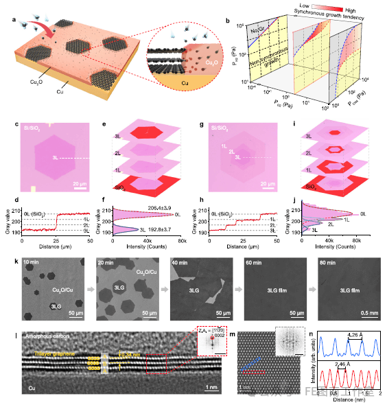 图1 | 三层石墨烯的同步外延生长。a 异质Cu-Cu2O基底催化同步生长过程的示意图,插图为石墨烯边缘-Cu-Cu2O三相界面结构。b 展示同步生长模式下氧气、甲烷和氢气分压关系的三维生长窗口示意图。c-j 分别显示通过同步模式(c-f)和反向蛋糕(IWC)模式(g-j)生长的三层石墨烯岛的光学显微镜图像及光学对比度分析,样品均转移至285 nm厚Si/SiO2基底。k 不同生长时间(10、20、40、60和80分钟)三层石墨烯岛与薄膜的扫描电子显微镜(SEM)图像。l 三层石墨烯的截面透射电子显微镜(TEM)图像,插图为红色区域采集的快速傅里叶变换(FFT)衍射图(标尺:1 nm−1)。m 所得三层石墨烯的扫描透射电子显微镜(STEM)图像,插图为对应FFT衍射图(标尺:10 nm−1)。n 沿m图中红蓝框标注方向的强度分布曲线。