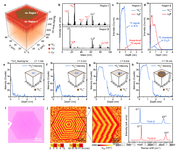图2 | 通过二次离子质谱(ToF-SIMS)和同位素标记技术探索同步生长机制。a 显示在Cu-Cu2 18O基底上生长的三层石墨烯岛中13C2−、18O−和Cu−离子分布的三维ToF-SIMS图。b 区域I和II获得的负离子谱。c,d 分别展示区域I(c)和区域II(d)中13C2−和18O−离子强度的深度分布曲线。e-h 不同13CH4进料时间(1、3、6和18分钟)样品的13C2−强度深度分布曲线,插图显示13C2−强度的三维分布图。i-k 同位素标记三层石墨烯的光学显微镜图像(i)及对应的拉曼2D峰位图(j,k),揭示同步生长过程。l 从k图标记区域获取的13C和12C标记三层石墨烯的拉曼光谱。