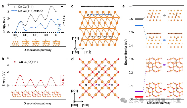 图3 | 密度泛函理论(DFT)计算阐明Cu2O对CH4解离及碳扩散机制的影响。a,b分别展示Cu(111)表面含氧(a)与不含氧状态及Cu2O(111)表面(b)上烃基自由基的解离路径与对应能垒。c,d呈现碳原子在Cu(c)与Cu2O(d)晶格中的扩散路径。e系统比较碳原子穿越Cu与Cu2O晶格的扩散势垒。