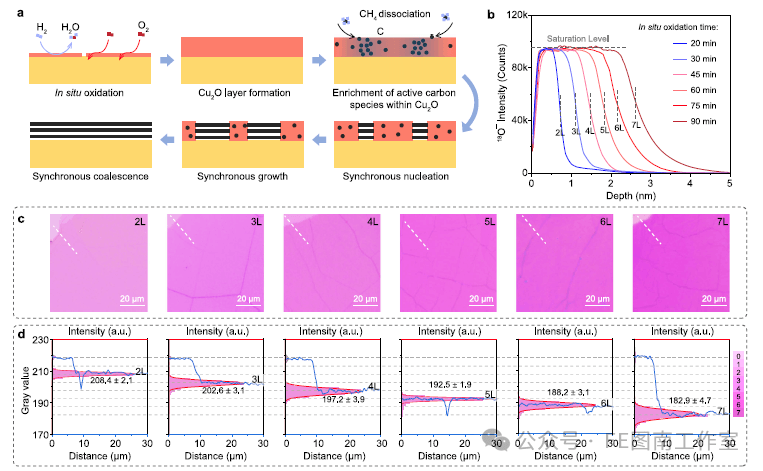 图4 | 不同层数石墨烯薄膜的可控制备a 同步模式控制石墨烯薄膜生长的基本步骤示意图。b 不同原位氧化时间(20、30、45、60、75和90分钟)样品中18O−强度的飞行时间二次离子质谱(ToF-SIMS)深度分布。c,d 分别在Cu-Cu2O基底上通过同步生长获得的双层、三层、四层、五层、六层和七层石墨烯薄膜的光学显微镜图像(c)和光学对比度分析(d),各样品对应的原位氧化时间如b所示。