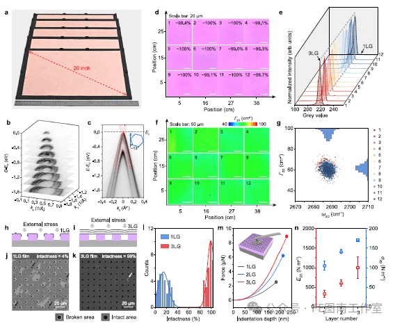 图5 | 三层石墨烯薄膜的工业化生产与表征a 展示铜箔上A3尺寸三层石墨烯薄膜的光学照片。b 通过角分辨光电子能谱(ARPES)测量获得的ABA堆叠三层石墨烯在铜箔上的等能线轮廓。c 跨越K点的能带色散关系。插图:倒易空间中的切割方向。红色虚线:ABA三层石墨烯的理论能带结构。d 覆盖整个A3尺寸样品的4×3阵列光学显微镜图像(Si/SiO2基底),百分比表示光学显微镜(OM)观测到的三层石墨烯覆盖率。e 对应阵列d中区域的光学对比度分析。f 覆盖全样品的4×3阵列拉曼映射图(2D峰半高宽Γ2D)。g 拉曼映射f中对应的ω2D(2D峰位置)与Γ2D分布统计。h-k 悬空三层(h,j)与单层(i,k)石墨烯薄膜在盲孔基底上的示意图(h,i)和SEM图像(j,k)。注:SiO2孔边缘断裂处因电荷效应显示亮度增强。l 相同转移条件下单层与三层石墨烯薄膜完整度的统计直方图。m 原子力显微镜(AFM)纳米压痕测试中悬空石墨烯薄膜的典型力-位移曲线。插图:AFM纳米压痕示意图。n 悬空单层、双层及三层石墨烯薄膜的二维杨氏模量(E2D)和断裂强度(σ2D)提取结果。误差棒来源于多孔测量数据的统计计算。
